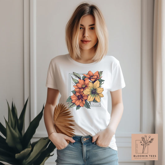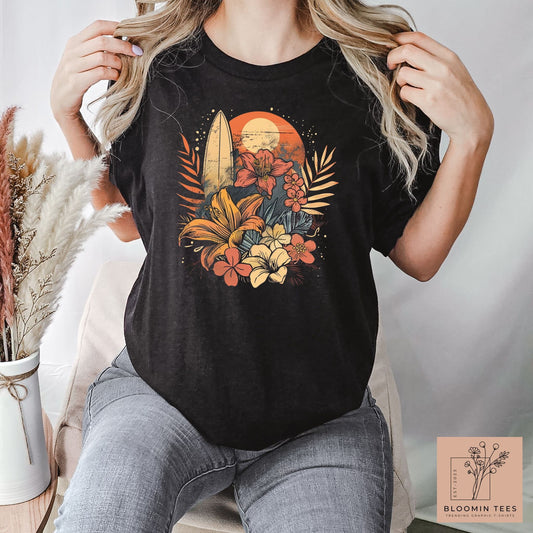 Surf Floral Boho Graphic T-shirt, Tropical Flowers, Summer Tee for her, Women's Surf shirt, Beach Tee, Vintage Flower Tee, Vintage Colors